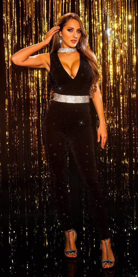 Tuta intera Jumpsuit laminata con Strass - Nero