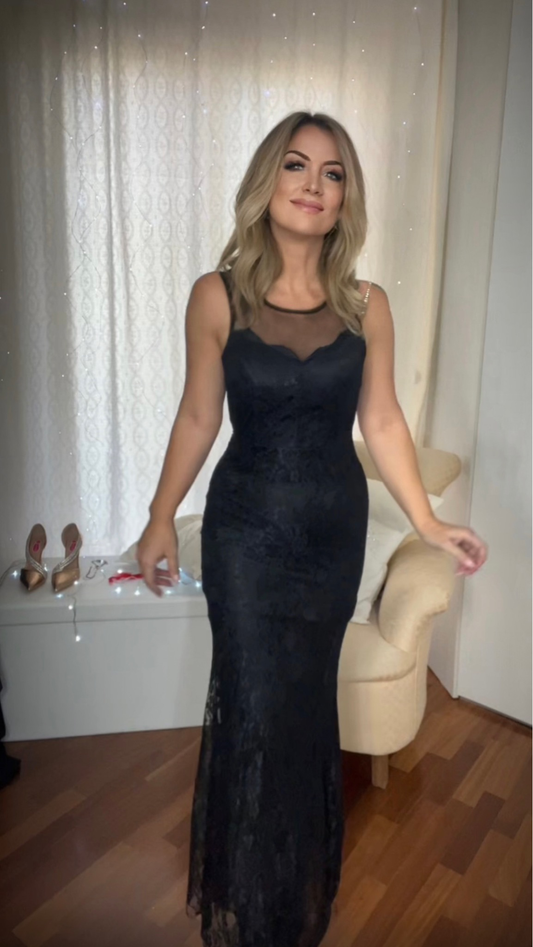 Abito da sera lungo pizzo e perline nero – Occasione Outlet