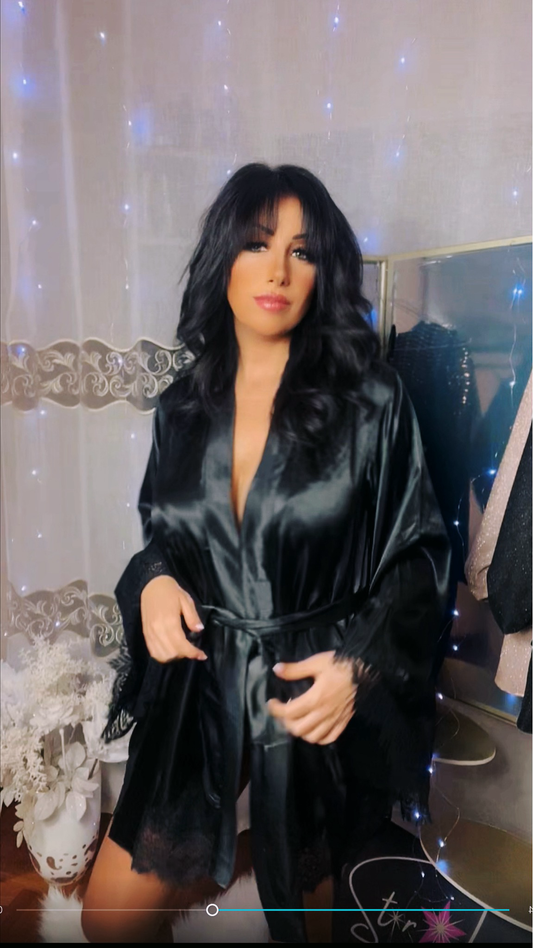 Vestaglia effetto raso con cintura e pizzo - Nero