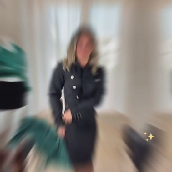 L’abito blazer corto in suede nero rappresenta l’incontro perfetto tra femminilità e raffinatezza. Realizzato in morbido tessuto effetto scamosciato, avvolge la silhouette con una linea strutturata e sensuale. Il design doppiopetto, impreziosito da bottoni decorativi, si unisce alla cintura coordinata in tessuto per definire con eleganza il punto vita.