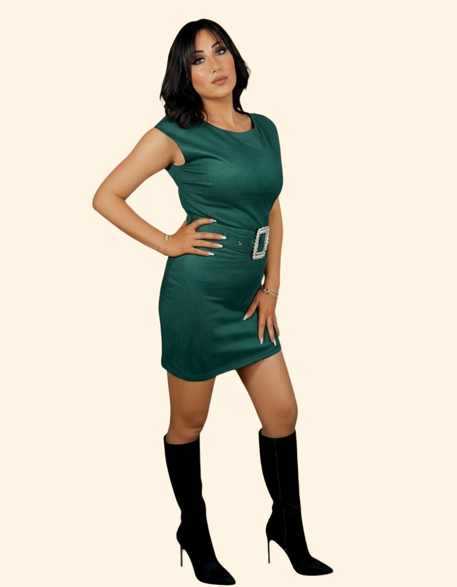 Abito Tubino in Suede con Cintura Gioiello - Verde
