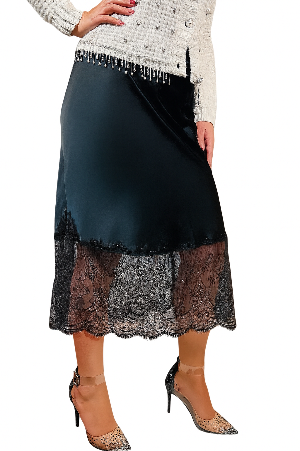 Gonna midi in raso con pizzo e cristalli applicati a mano ✨